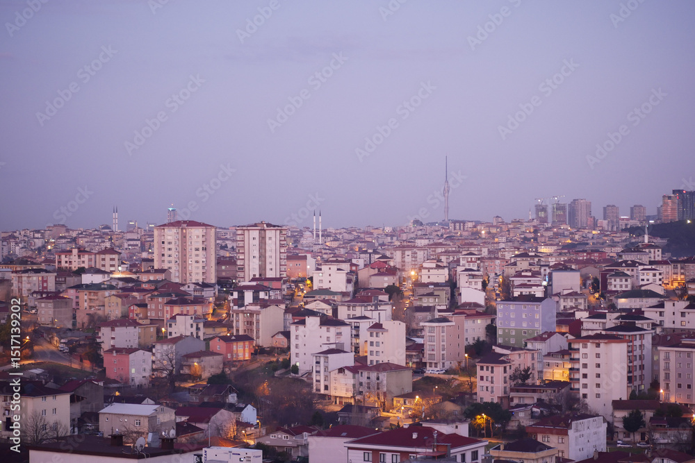 City skyline at dusk showcasing residential architecture