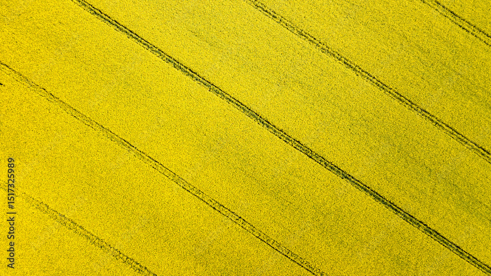 Aerial drone top view of yellow blooming field of rapeseed. Yellow nature background.