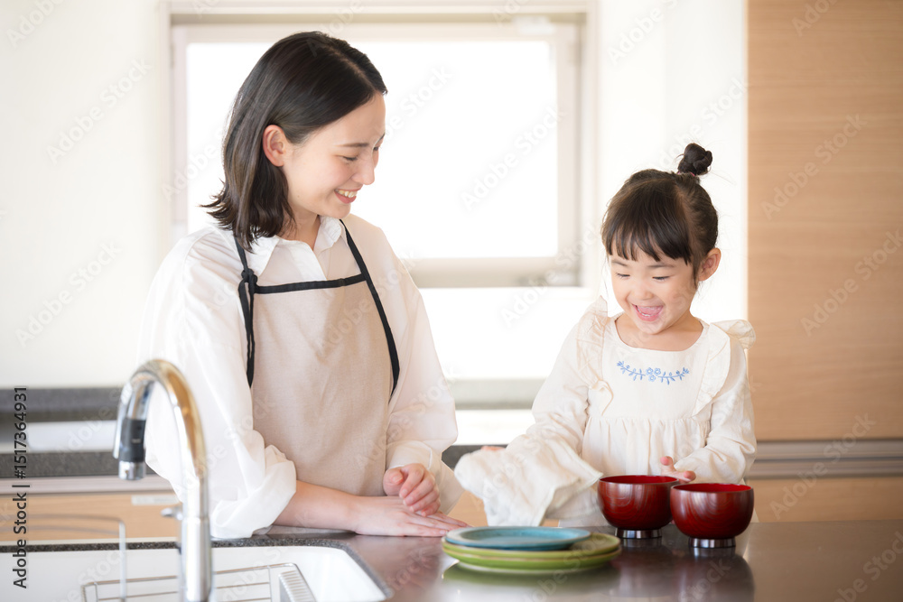 一緒にキッチンで楽しく料理をする親子 子供のお手伝い