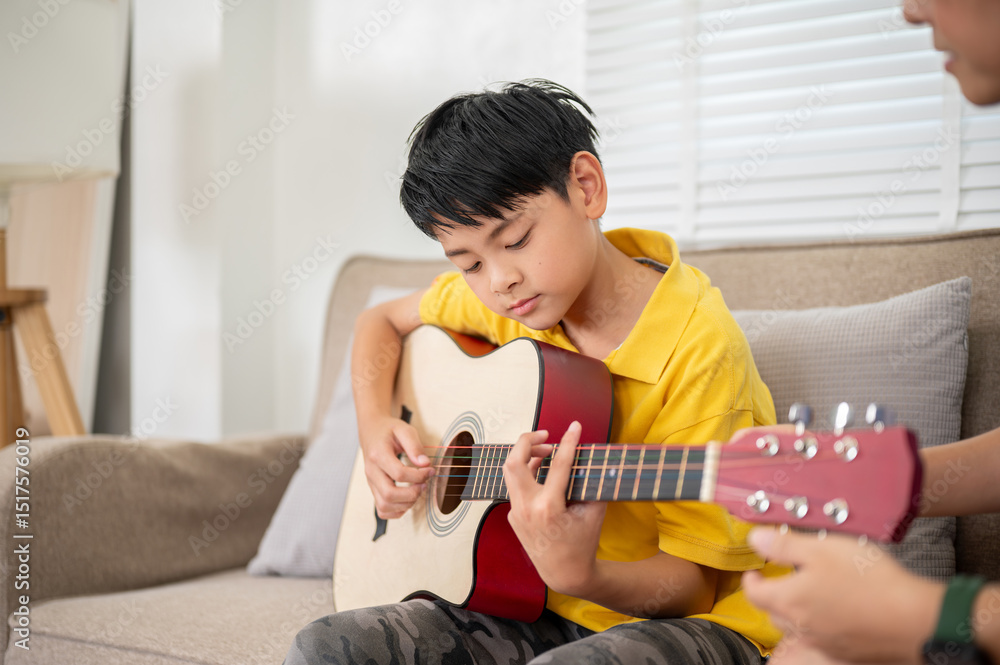 Close up of asian elementary kid playing a classic guitar on sofa in living room or music school.