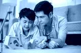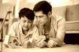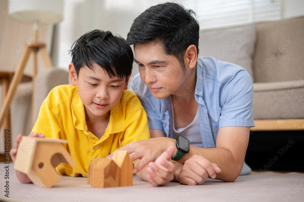 Close up of father and his elementary son looking at wooden house block toy on carpet in living room