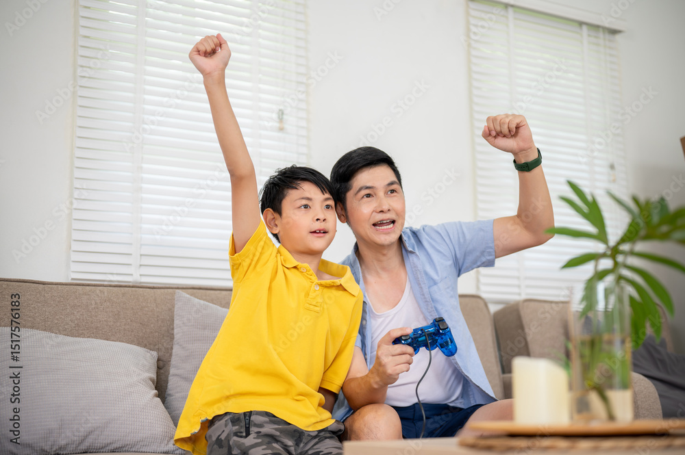 Asian father holding joystick playing game and raise a fist with his elementary son at sofa in house