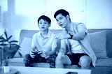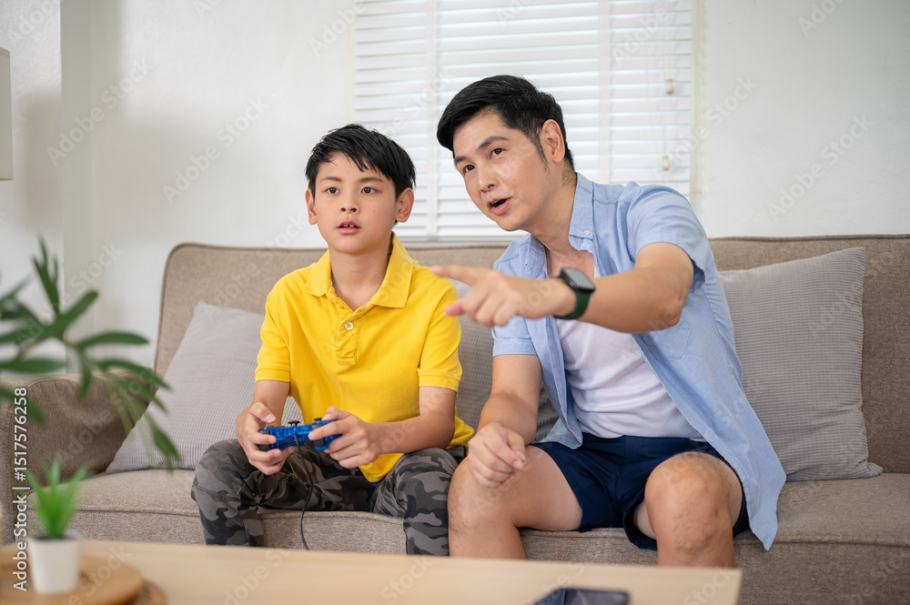 Asian father teaching elementary school son holding a joystick to play video game at sofa in a house