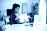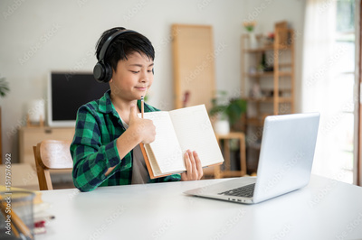 Asian kid elementary school boy wearing headphones showing a notebook in front of a laptop on table.