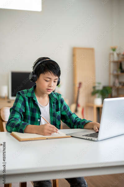 Asian kid elementary school boy wearing headphone writing with pencil in notebook and hand on laptop