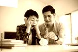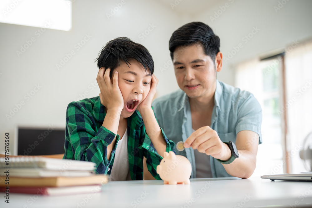 A son looking shocked while his father putting a coin in pink piggy bank. Saving pocket money.