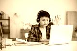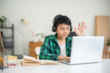 Asian kid elementary school boy wearing headphone looking at white laptop on table with an arm raise