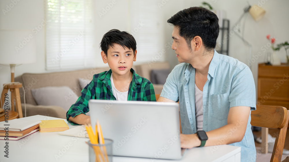 Father and son talking in front of a laptop while teaching and doing homework together.