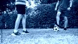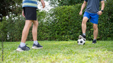 Close up of a father and son legs while playing soccer or football together in backyard or grass field.