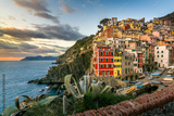 Scenic view of the village of Riomaggiore in Cinque Terre in Italy against dramatic sky at sunset