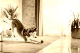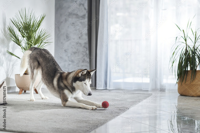 A Siberian husky is playfully crouched, about to pounce on a red ball. The modern living room is filled with light and a potted plant.