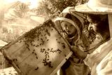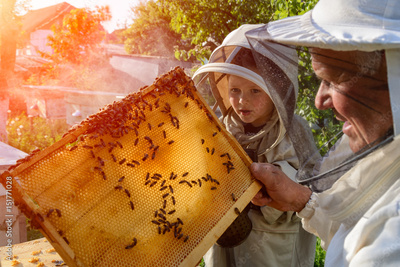 Experienced beekeeper grandfather teaches his grandson caring for bees. Apiculture. The concept of transfer of experience.
