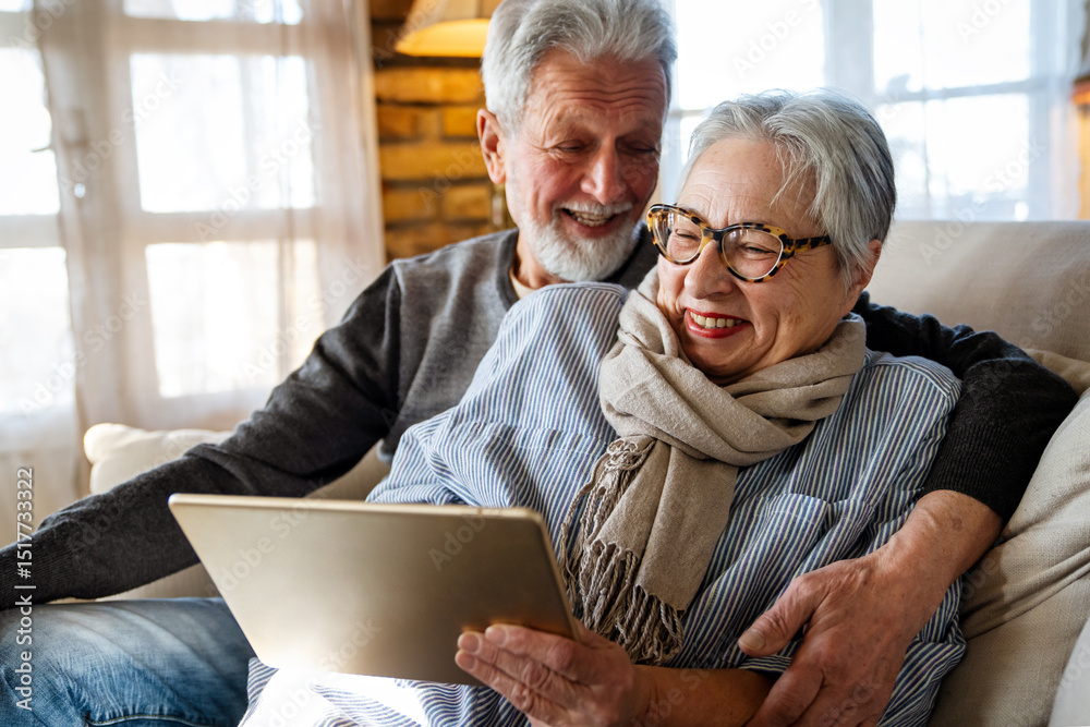 Elderly couple enjoying a tablet. Senior man and woman smiling, bonding over technology.