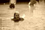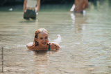 Young woman happily swimming and relaxing in a clear and refreshing natural river on a sunny day.
