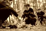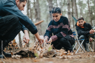 A small group of friends preparing a campfire in a serene forest during a winter picnic outing, emphasizing teamwork, outdoor adventure, and bonding with nature.