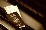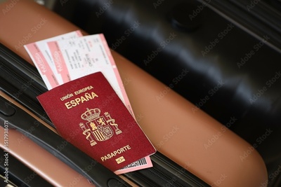 Spanish passport with tickets lies on touristic suitcase close up in airport waiting hall