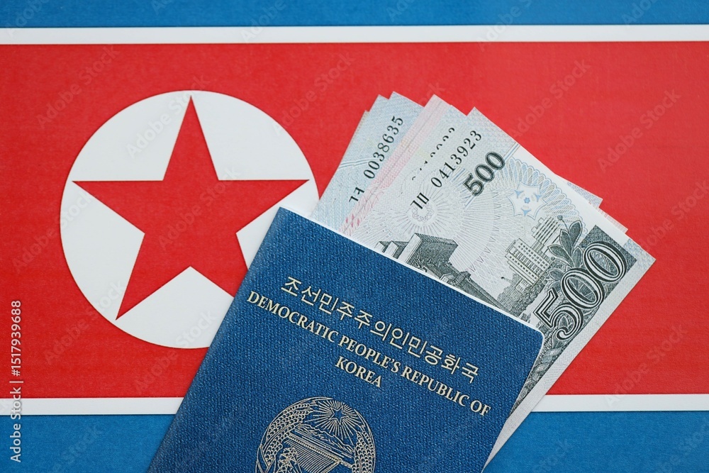 North Korean won money bills in big amount and passport lies on People Republic of Korea flag