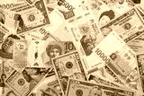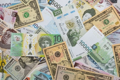 Big amount of money bills of different currencies and countries. Assortment background of international cash in big pile close up