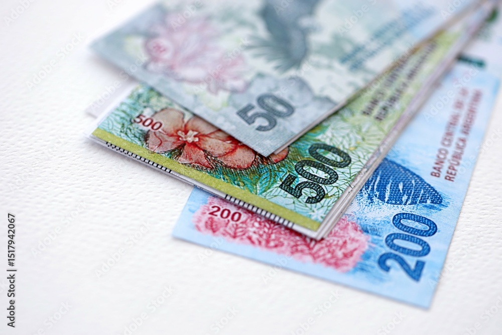 Argentine pesos money bills in big amount lies on white table close up