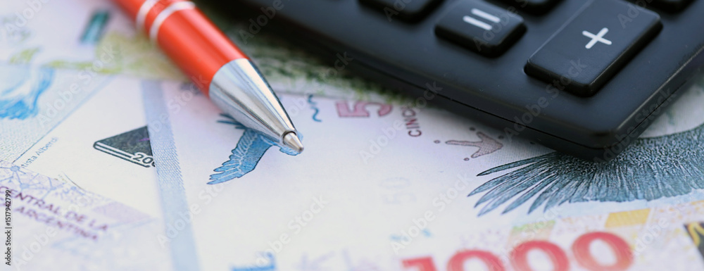 Argentine pesos money bills in big amount lies on table with pen and calculator close up