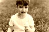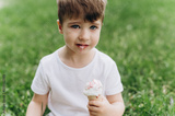 Smiling boy enjoying ice cream in a waffle cup on a sunny summer day.