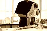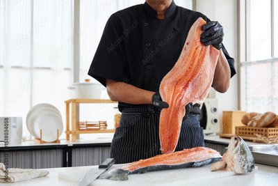 close up chef holding and showing a big raw salmon meat in the kitchen
