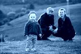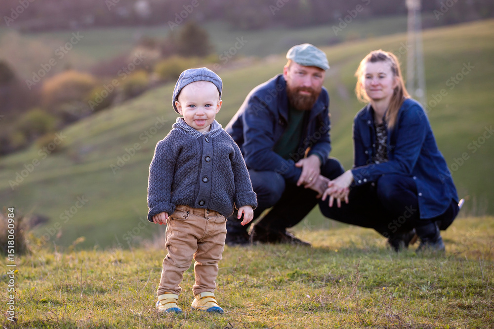 Happy family with a little son enjoying spring sunset outdoor.