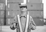 Engineer or worker wearing virtual reality glasses(VR) in containers warehouse storage