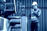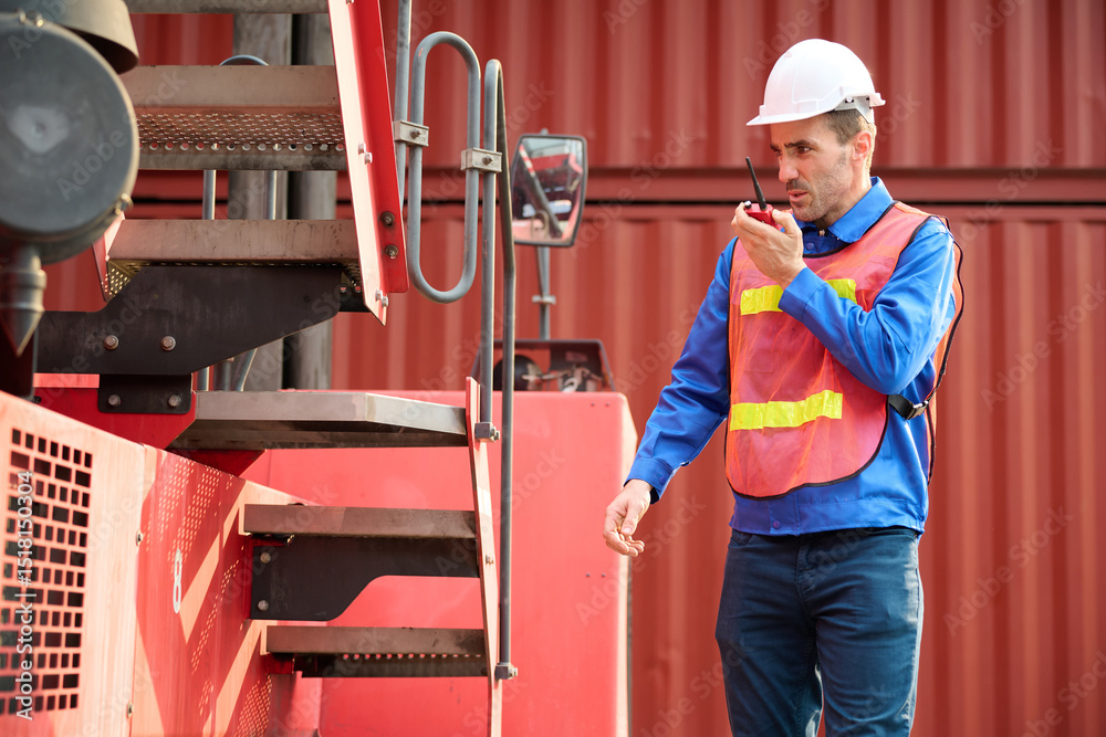Worker or Engineer using walkie talkie and checking loaded container handler at containers warehouse storage