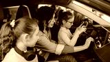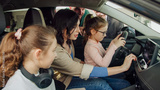 In a modern car dealership, a manager shows and advises a young family with children about buying or test driving a modern car. The concept of buying or leasing a new car.