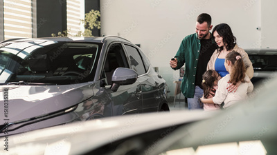 A happy young family gets the keys to their new car at a modern car dealership. The end of a test drive or purchase of a new car.