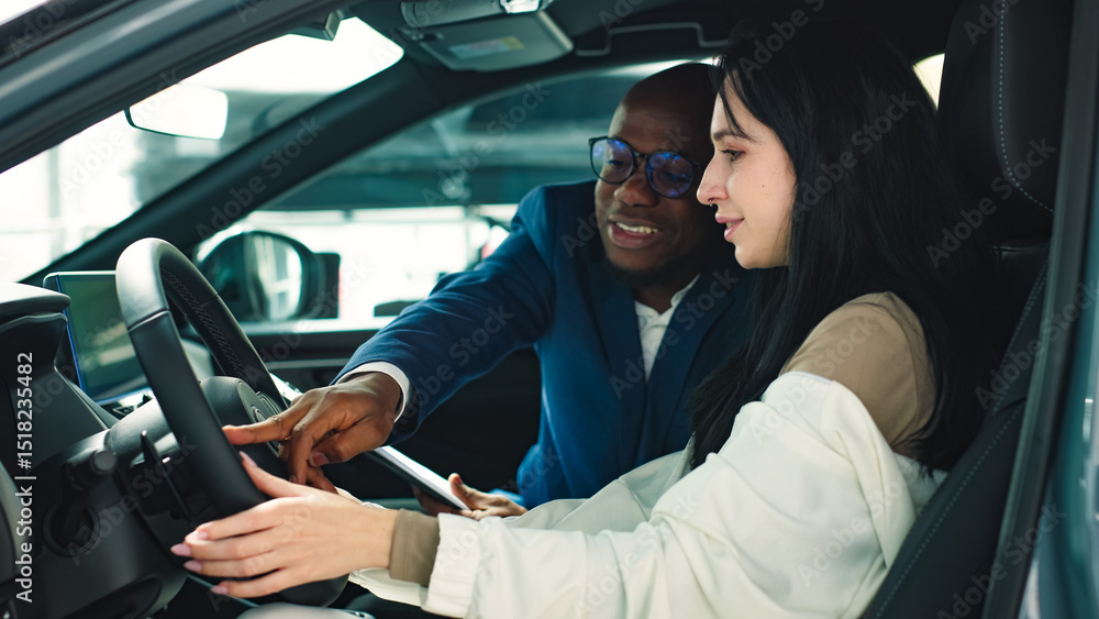 A car dealer in a modern car dealership advises a customer on buying or leasing a new car. The concept of an expensive purchase or lease of a modern automobile.