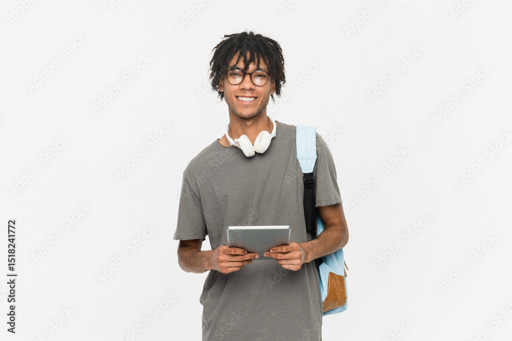 Young teen boy guy IT student in casual backpack bag using holding digital tablet pad touchscreen look at camera isolated on white background. High school university college concept