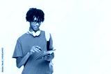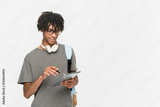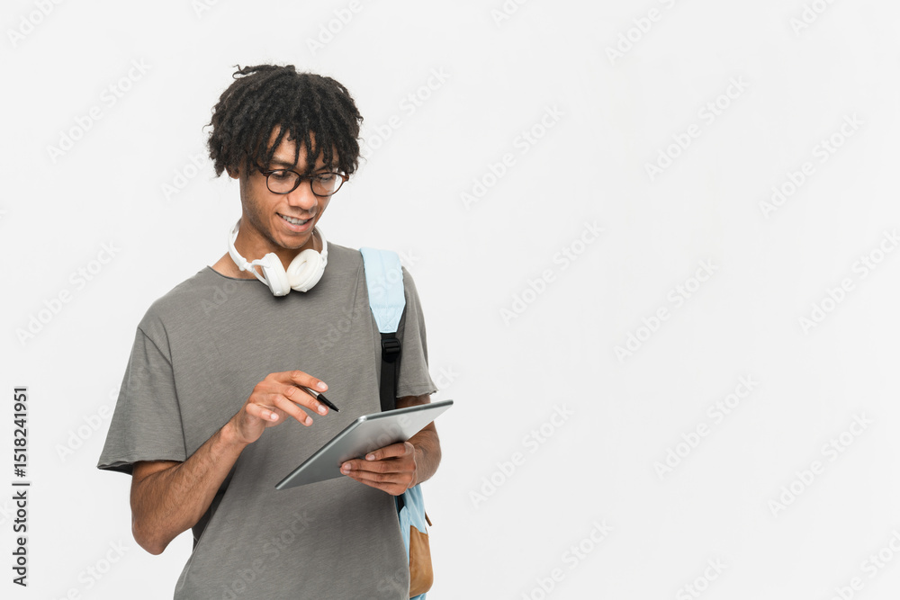 Young teen boy guy IT student in casual backpack bag using holding working digital tablet pad touchscreen look at camera isolated on white background. High school university college concept copy space