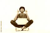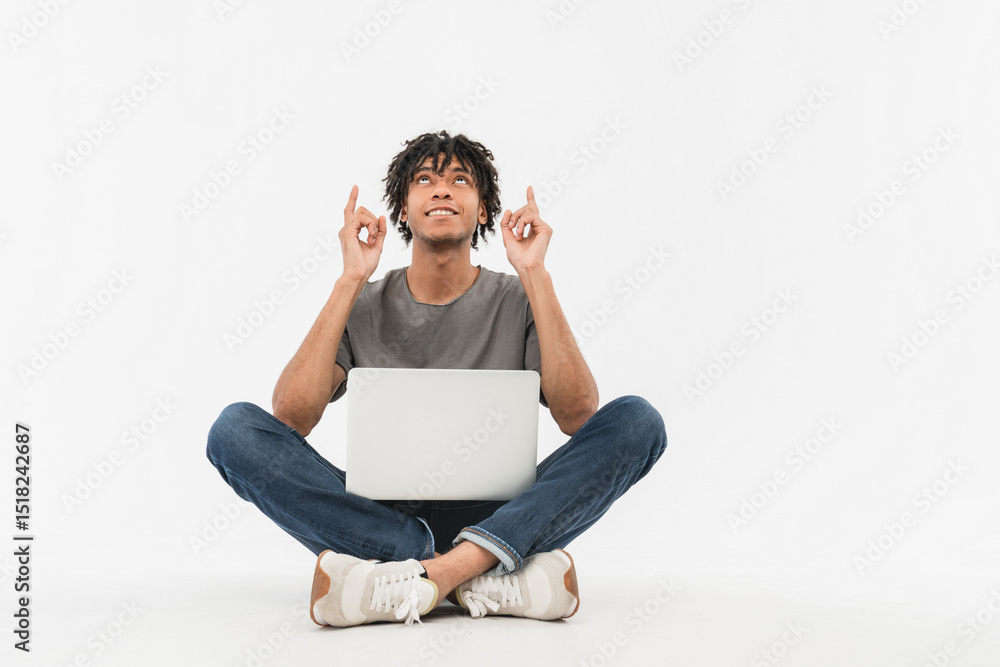 Full body amazed young IT man of African American ethnicity wear casual clothes sit hold use work on laptop pc computer point index fingers up top on area isolated on plain white color background