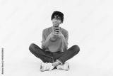 Full body young smiling cheerful male student fun happy black man guy boy in casual clothes sitting on floor hold use mobile cell phone isolated on plain white background studio portrait.