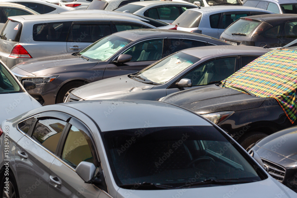 Outdoor parking lot with a lot of cars near shopping center