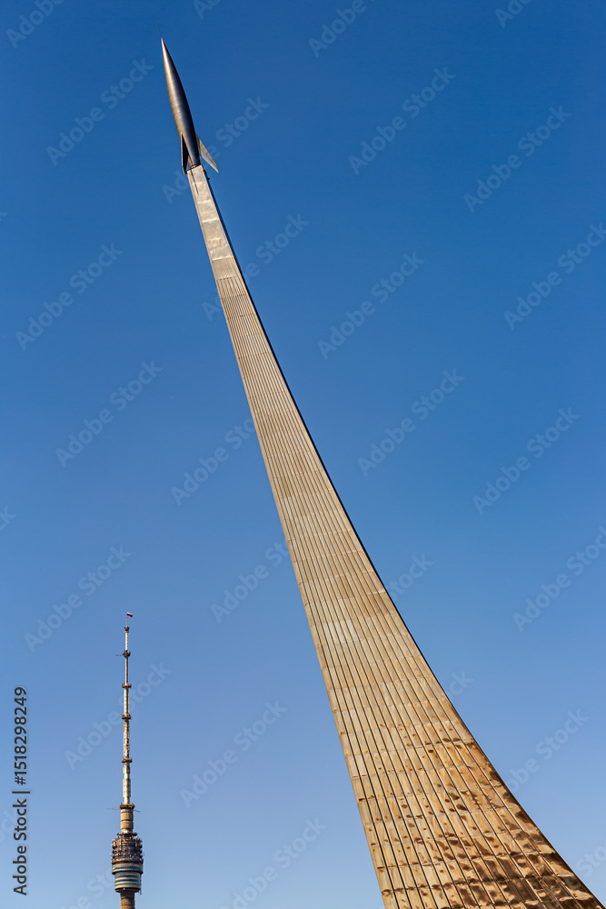 Conquerors of space monument near Vdnkh Metro station and Ostankino TV Tower in Moscow against blue sky