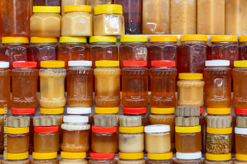 Many honey glass jars at Osh market in Bishkek, Kyrgyzstan