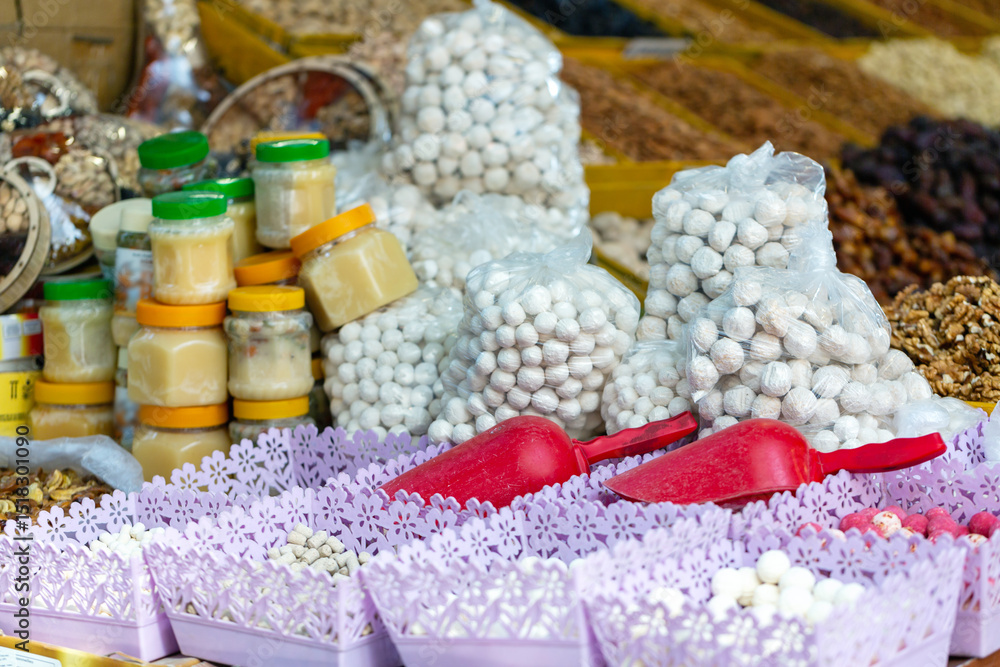 Many honey glass jars and Kurut cheese balls at Osh market in Bishkek, Kyrgyzstan