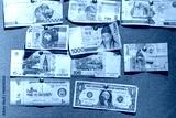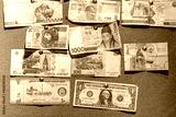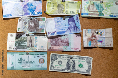 World international banknotes on a board background. US Dollar american money, Russian ruble, Oman, Indian and Uzbekistan currency. Business background