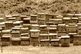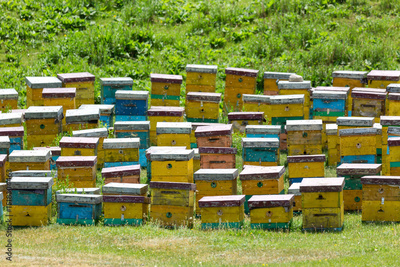 Mountain apiary with bees in the mountains of Kyrgyzstan near Issyk-Kul lake
