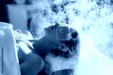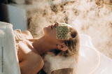 Young blonde woman on steam spa scalp treatment with eye mask and hair warming therapy.