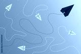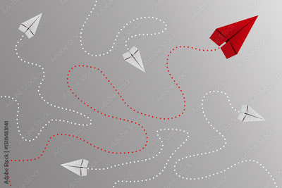 Paper plane leadership concept - red paper plane leading the row going in the other direction.