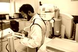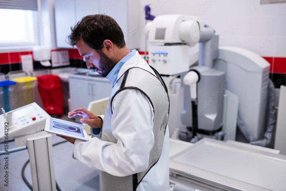 X-ray machine standing ready in hospital radiology room, with digital console and disposal bins