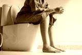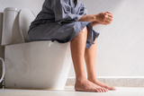 Woman sitting on the toilet bowl in the bathroom. She has stomach ache. Poor digestive system. Constipation. Diarrhea. Food poisoning. Health and medicine.