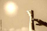 Hand of female holding sunscreen. Very sun light Sky background.Health concepts and skin care