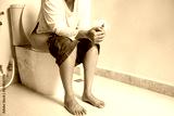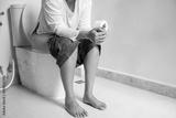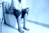 Woman sitting on the toilet bowl in the bathroom. She has stomach ache. Poor digestive system. Constipation. Diarrhea. Food poisoning. Health and medicine.