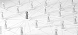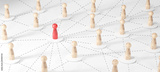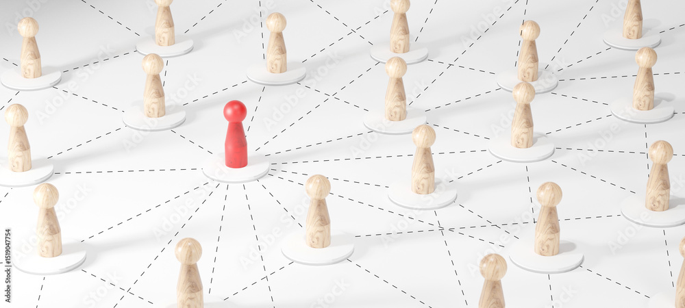 Minimalist wooden figures connected by dashed lines forming a network. Red center figure represents leadership, influence, hub, or central management in communication.