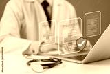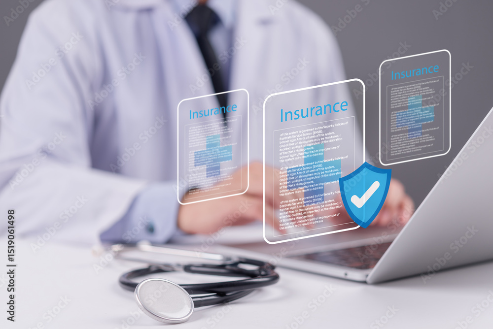 Health insurance concept with digital document interface and shield icon, smart insurance, and secure patient information.Healthcare data management